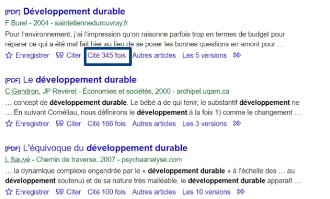 La meilleure manière de trouver des informations pertinentes pour votre sujet de mémoire, c’est d’entrer de bons mots clés dans le moteur de recherche de Google Scholar. En fonction des mots clés que vous aurez entrés, la plateforme vous proposera un ensemble de résultats ayant des connexions directes avec ces mots clés. Il est recommandé de mettre ces mots entre guillemets. Par exemple, vous pouvez taper « développement durable ».