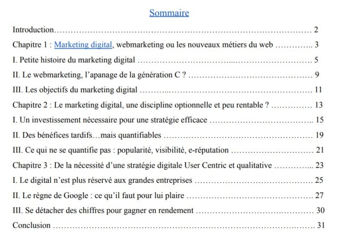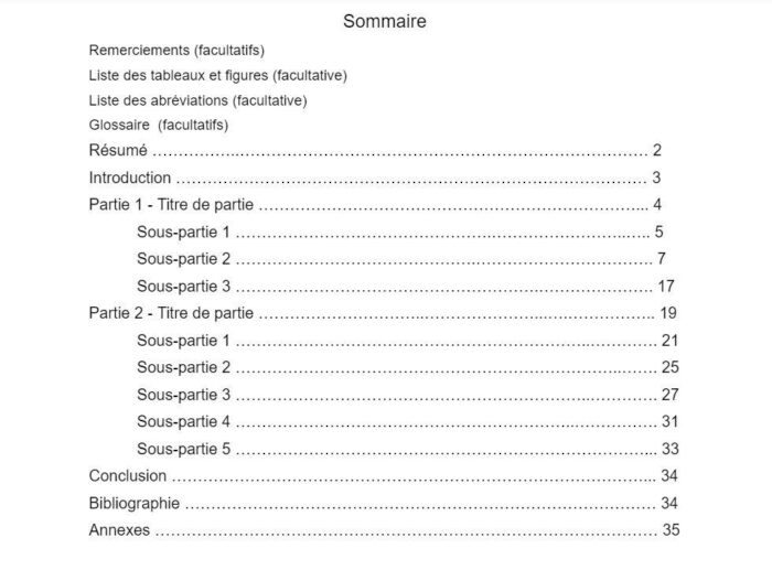 Le sommaire présente une vision synthétique du plan, il est donc plus court qu’une table des matières. Il se situe juste avant l’introduction et c’est à cette page qu’apparaît la pagination.