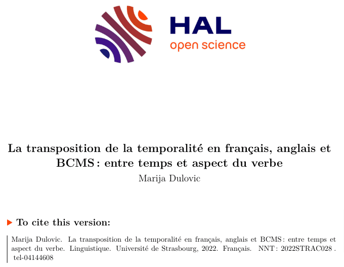- Marija Dulovic. Linguistique. Université de Strasbourg, 2022. Français. ⟨NNT : 2022STRAC028⟩;