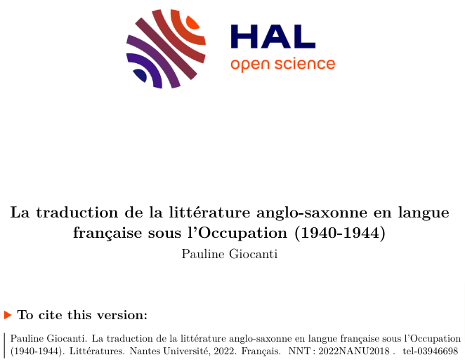 - Pauline Giocanti. Littératures. Nantes Université, 2022. Français. ⟨NNT : 2022NANU2018⟩;