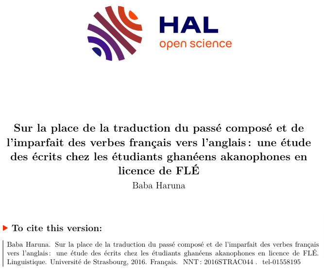 - Baba Haruna. Linguistique. Université de Strasbourg, 2016. Français. ⟨NNT : 2016STRAC044⟩;