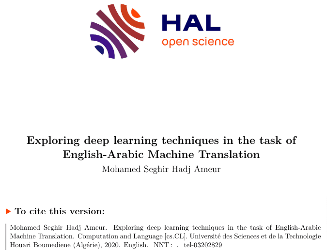 - Mohamed Seghir, Hadj Ameur. Computation and Language [cs.CL]. Université des Sciences et de la Technologie Houari Boumediene (Algérie), 2020. English. ⟨NNT : ⟩;